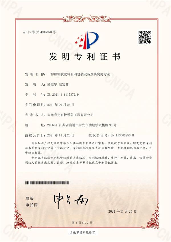 一種顆粒狀肥料自動(dòng)包裝設(shè)備及其實(shí)施辦法發(fā)明專利證書